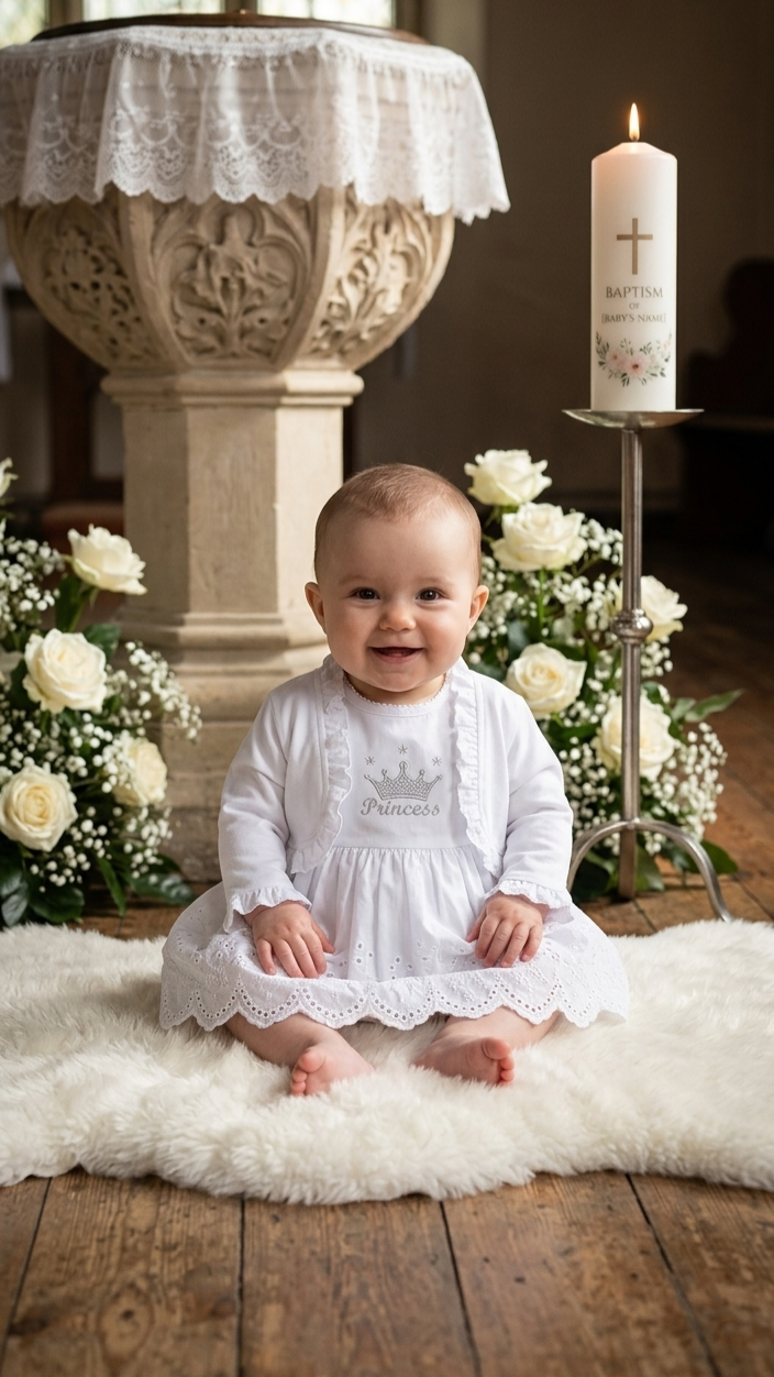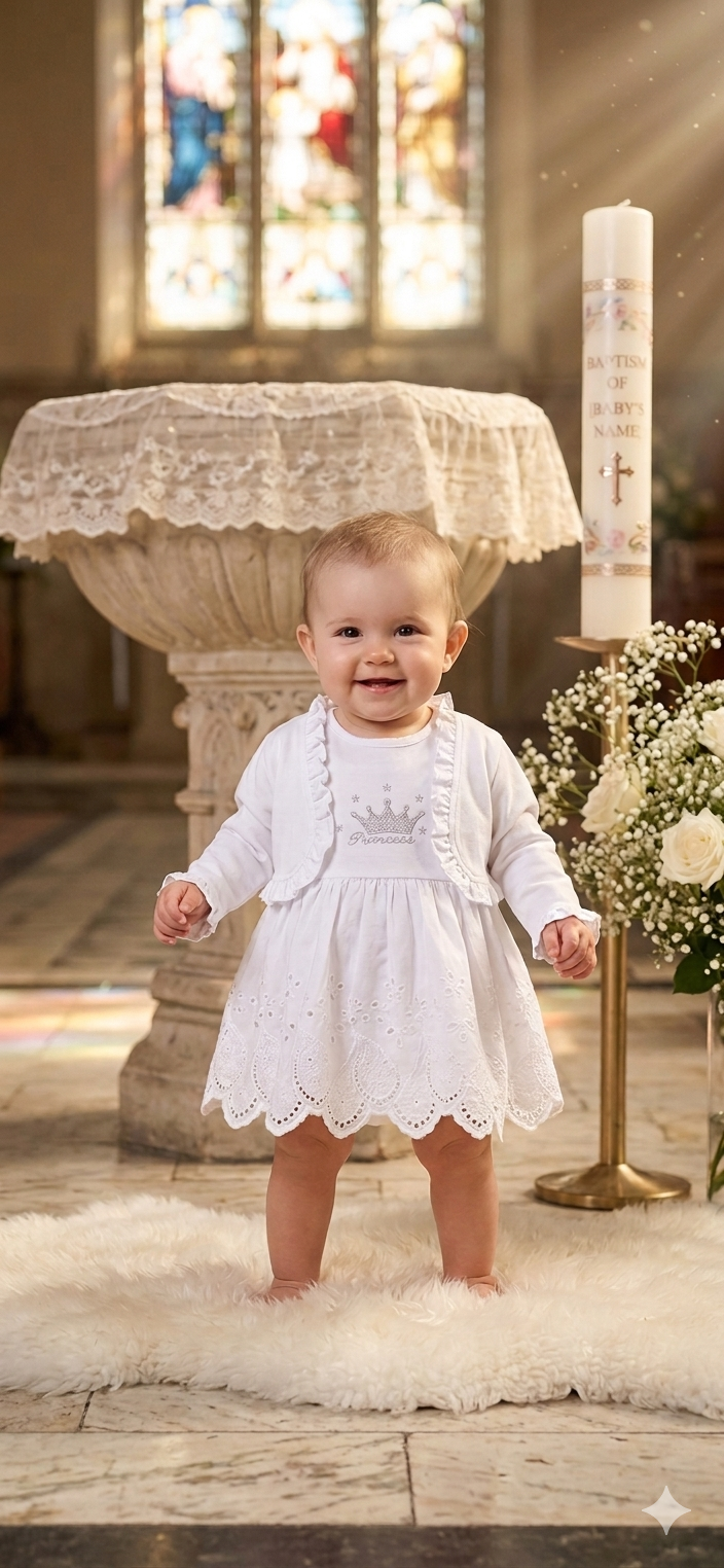 Niedliches Outfit für Taufe/Party/Geburtstag (3-teilig) für Baby Mädchen in Farbe weiß mit niedlicher Bestickung in Farbe Silber - Krone mit Sternen und Princess