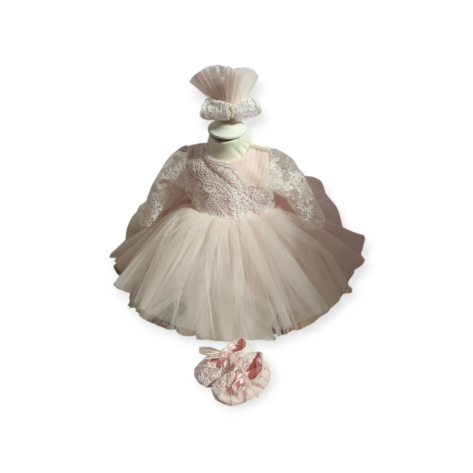 * Süße elegante Schuhe aus gleichem Stoff wie das Kleid passend zum Taufkleid mit niedlichen Perlen