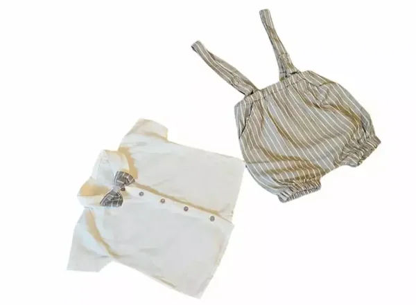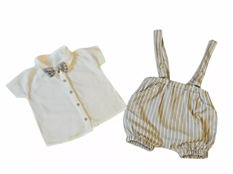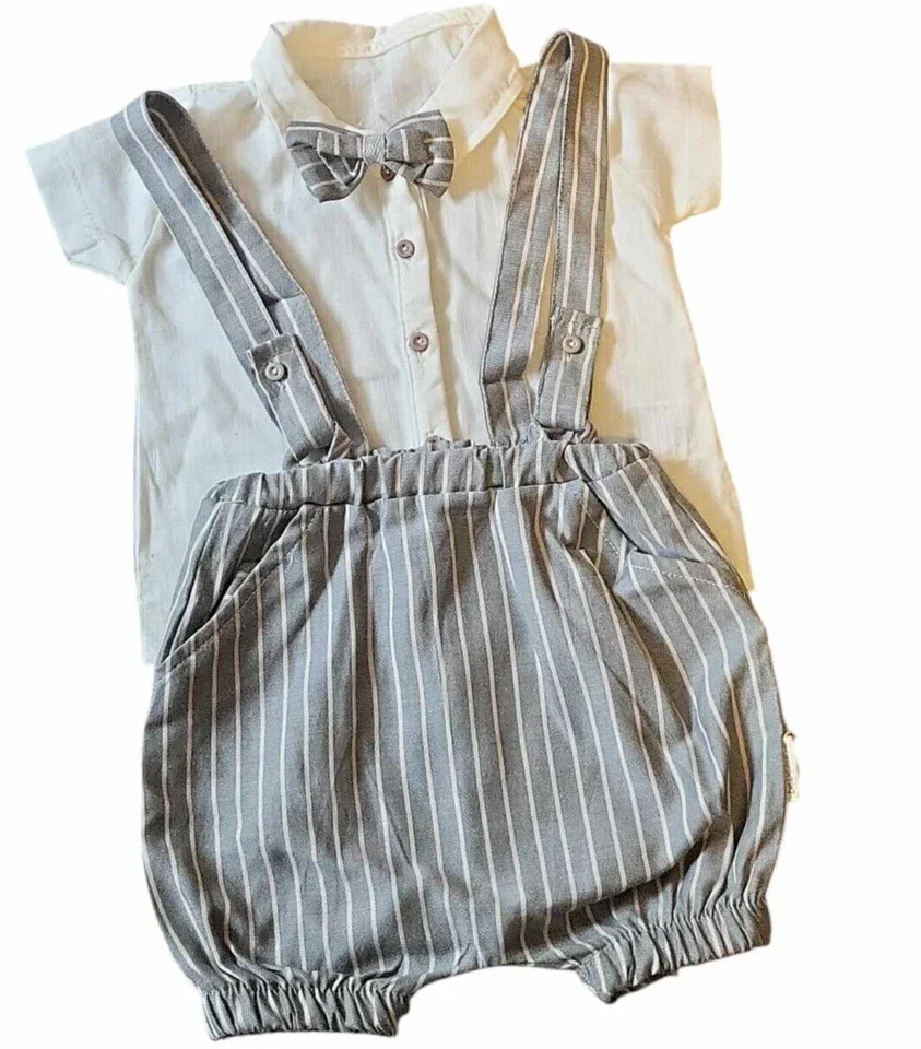 Das Set in weicher Qualität ist weich und Bequem. Das Produkt garantiert die gute Atmung für die Haut und einen bequemlichen Tragekomfort. Das Set ist ideal für Babys, aber auch für ihre Eltern: einfaches An- und Ausziehen. Tolle Geschenkidee auch für Freunden. Das Outfit in toller grauer/beiger Farbe mit süßer Fliege ist einfach perfekt für Sommertage.