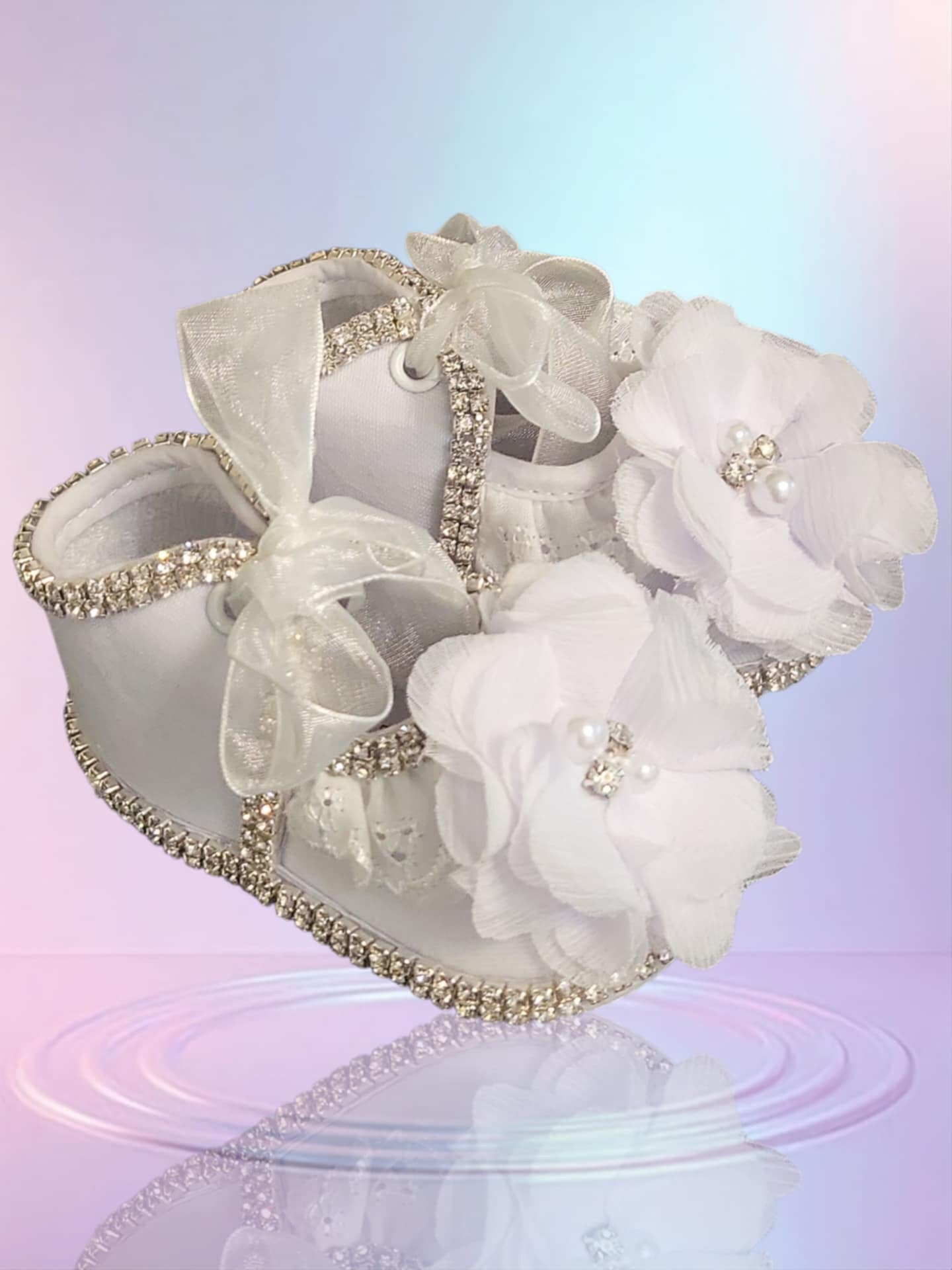 Die zuckersüßen Taufschuhe aus Stoff mit Schnüren aus Organza mit Steinen verziert, in Farbe weiß, überzeugen mit niedlichem Design.