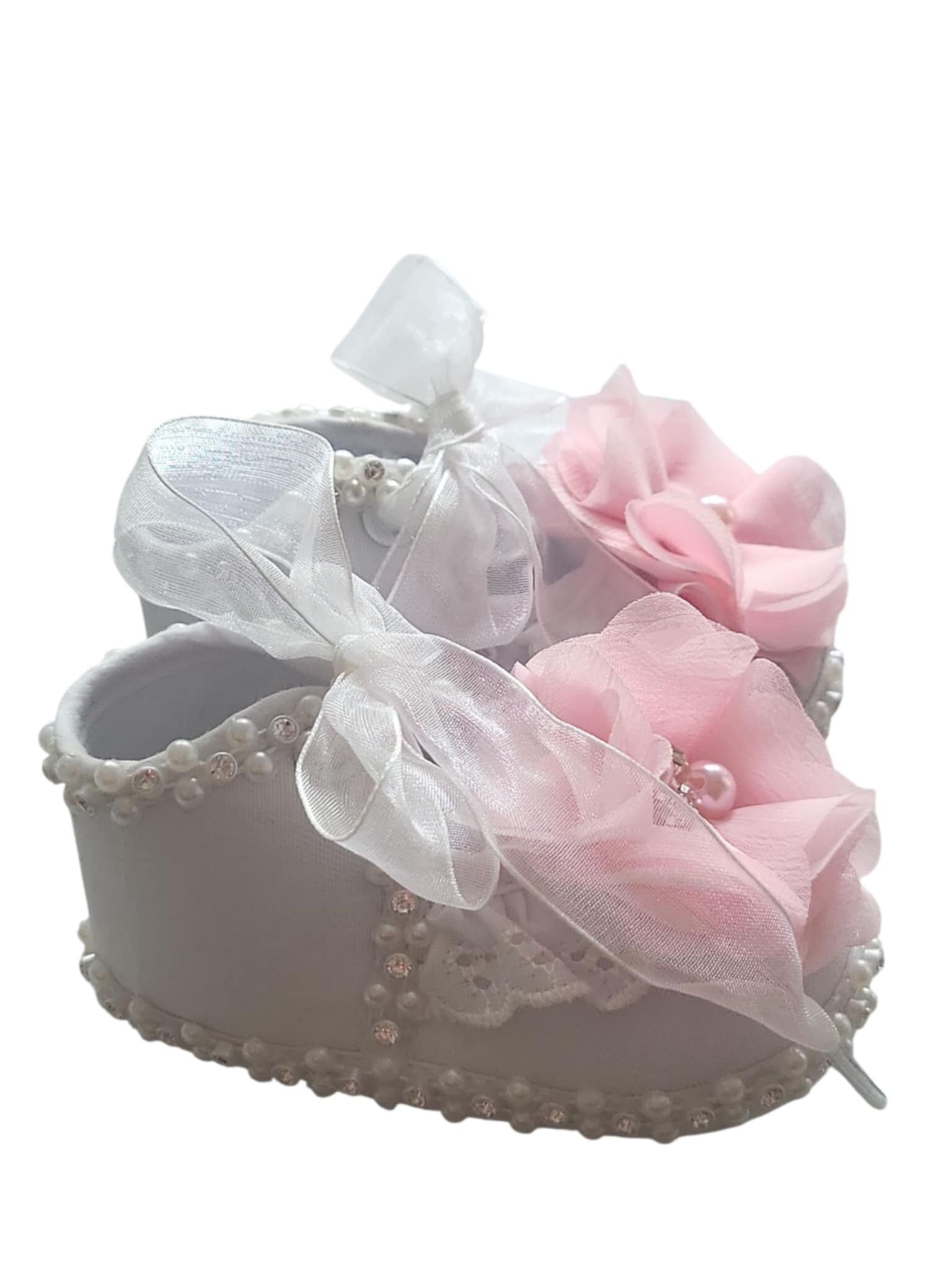Die Taufschuhe haben schöne Blume aus Organza vorne die die Schuhe sehr elegant für den Tag der Taufe machen . Die Blume in Farbe rosa hat in der Mitte Perlen und Steine .