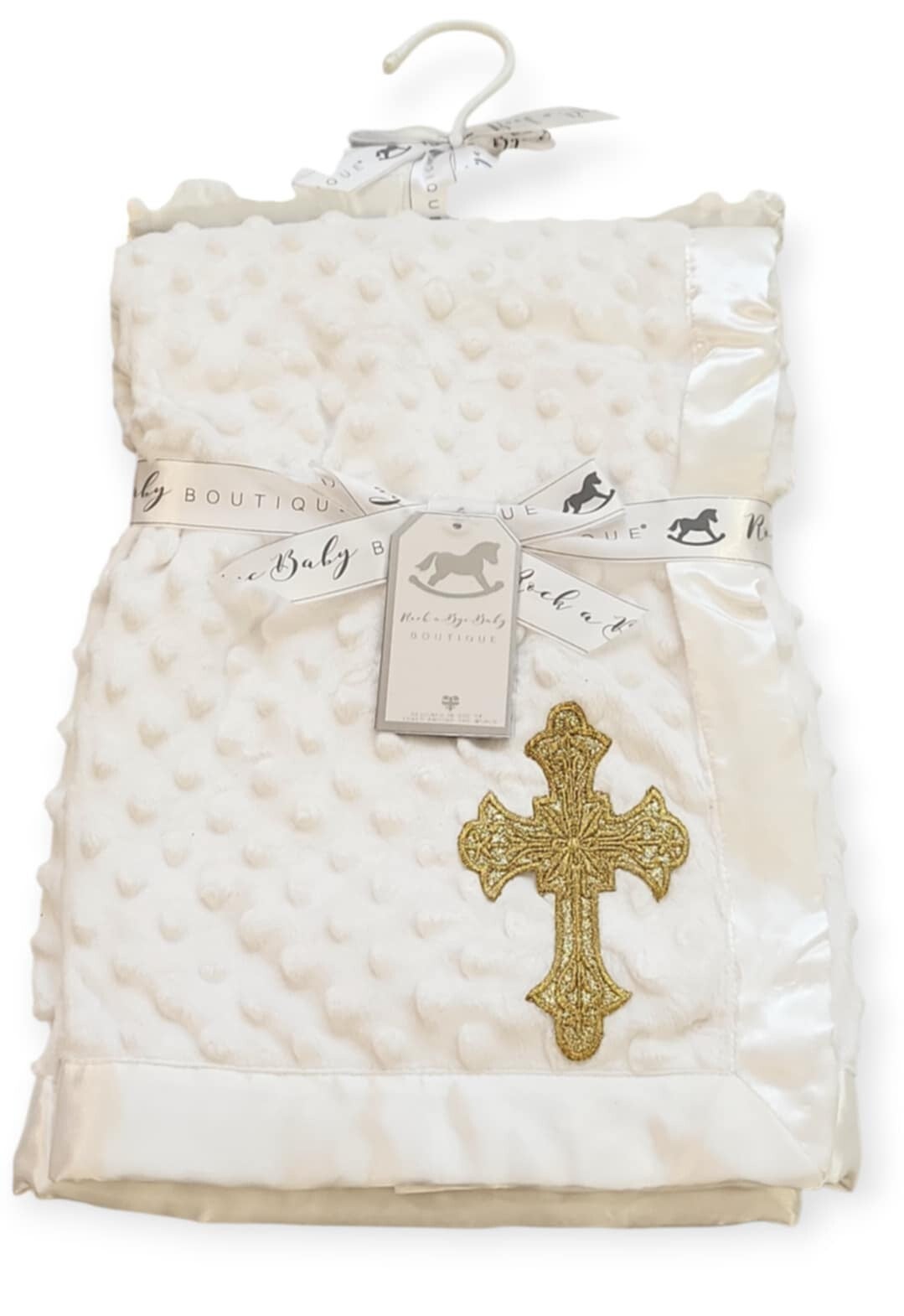 1. Taufdecke – luxuriöse Babydecke aus ultraweichem Bubble Velours, mit Satin-Aufhänger und edlem Kreuz in goldener Farbe.