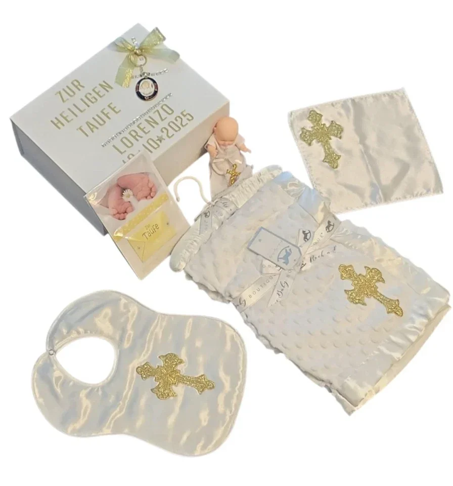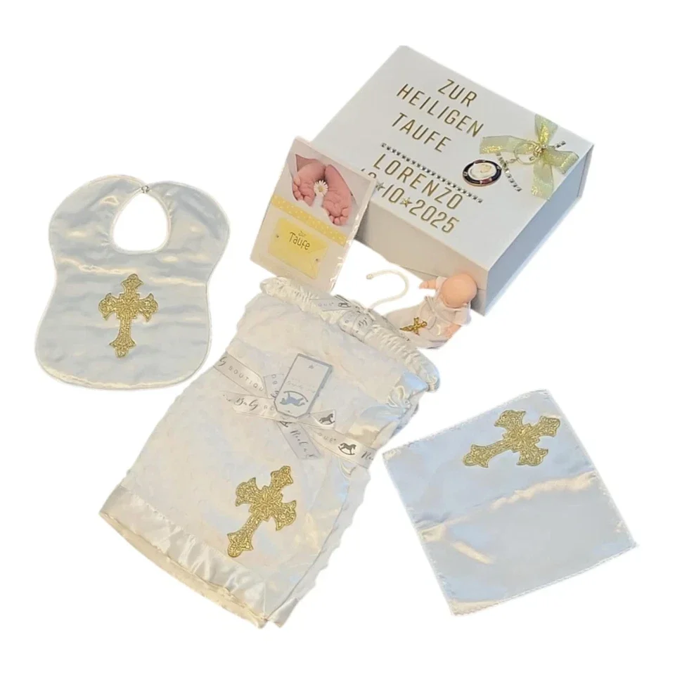 Alles wird in einer hochwertigen Geschenkbox mit Magnetverschluss (Maße: 31 × 20 × 11 cm) geliefert.Die Box ist personalisiert mit Buchstaben und und Zahlen – Name und Taufdatum machen sie zu einem ganz besonderen Erinnerungsstück.