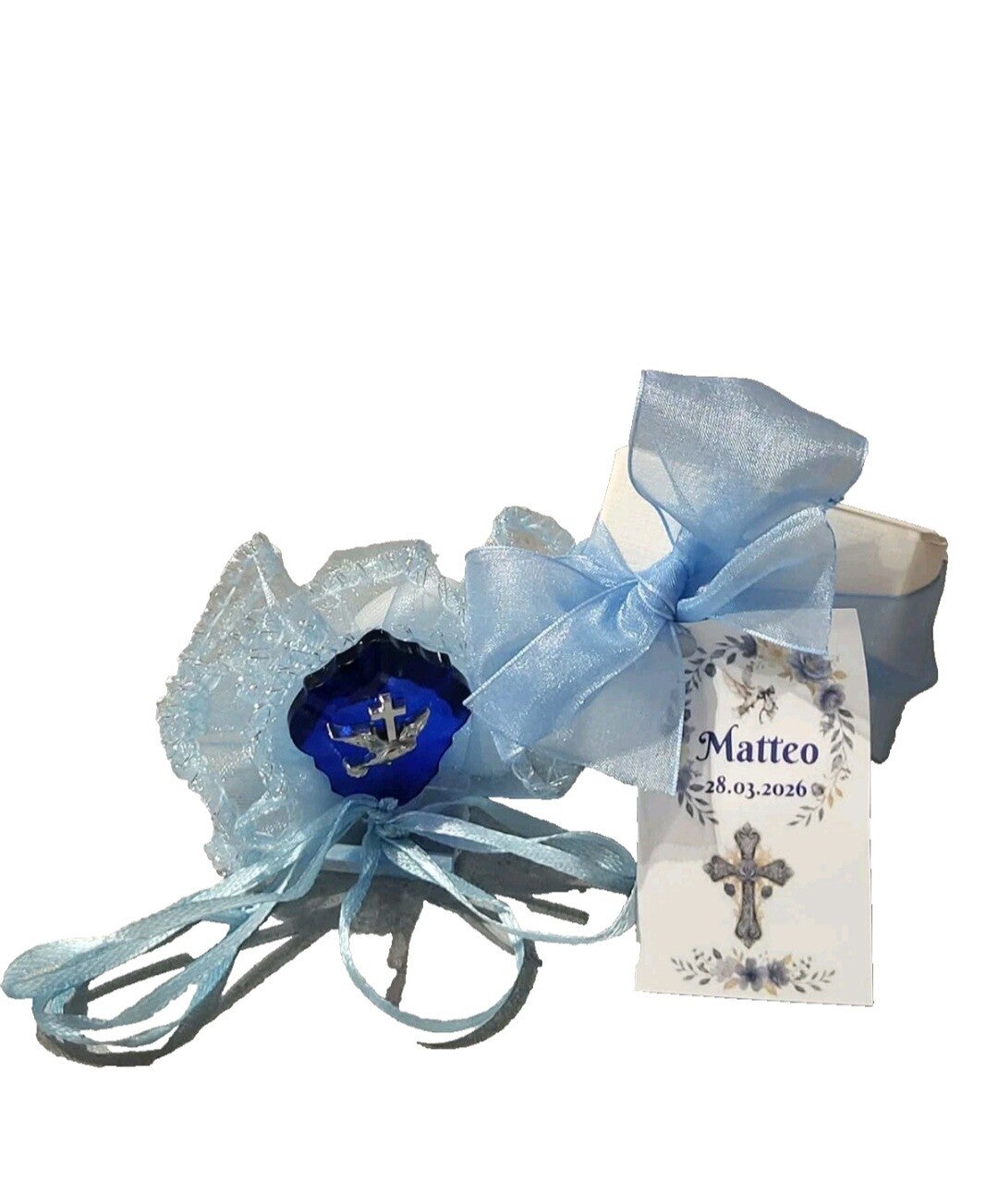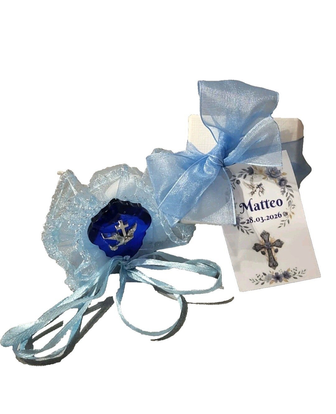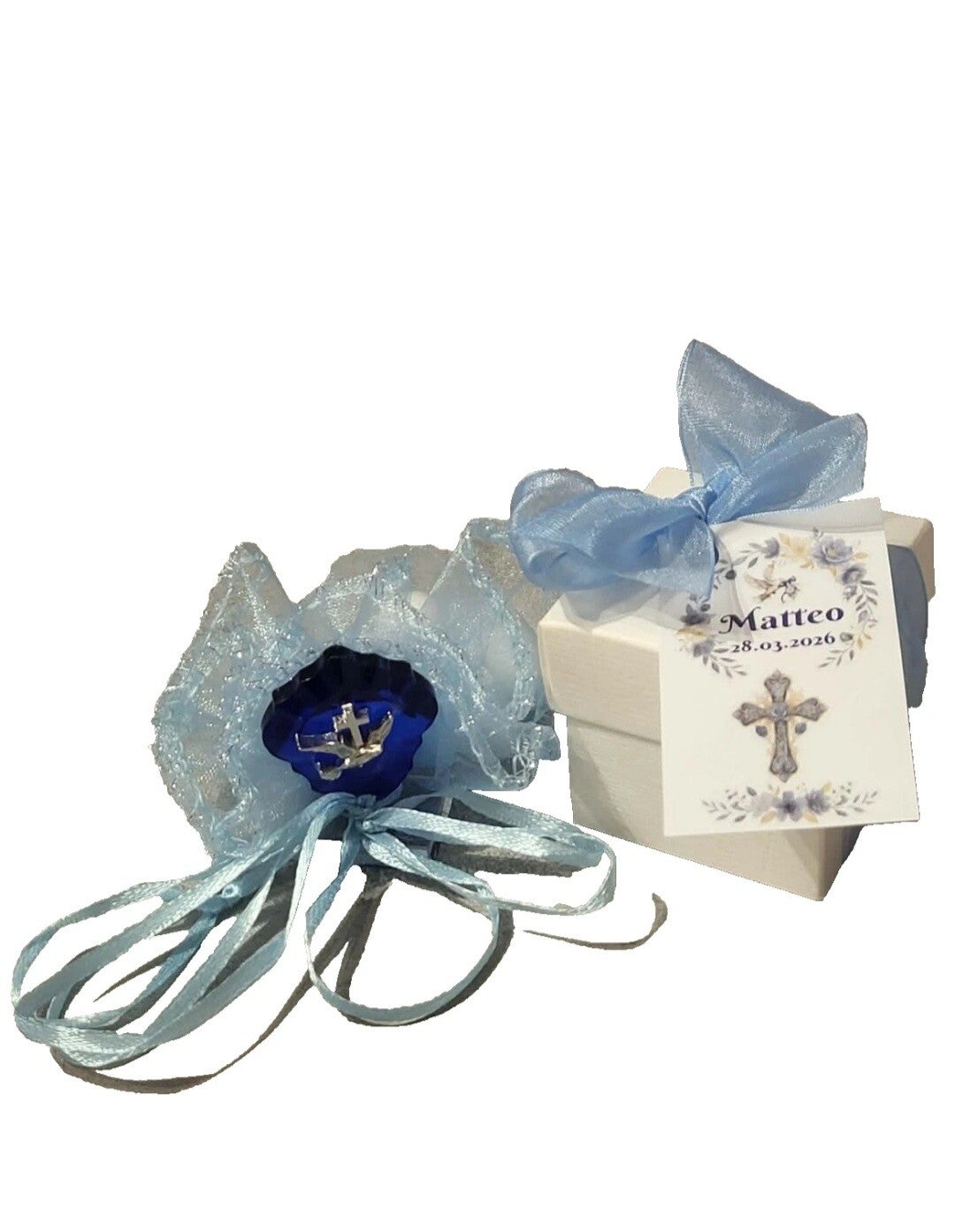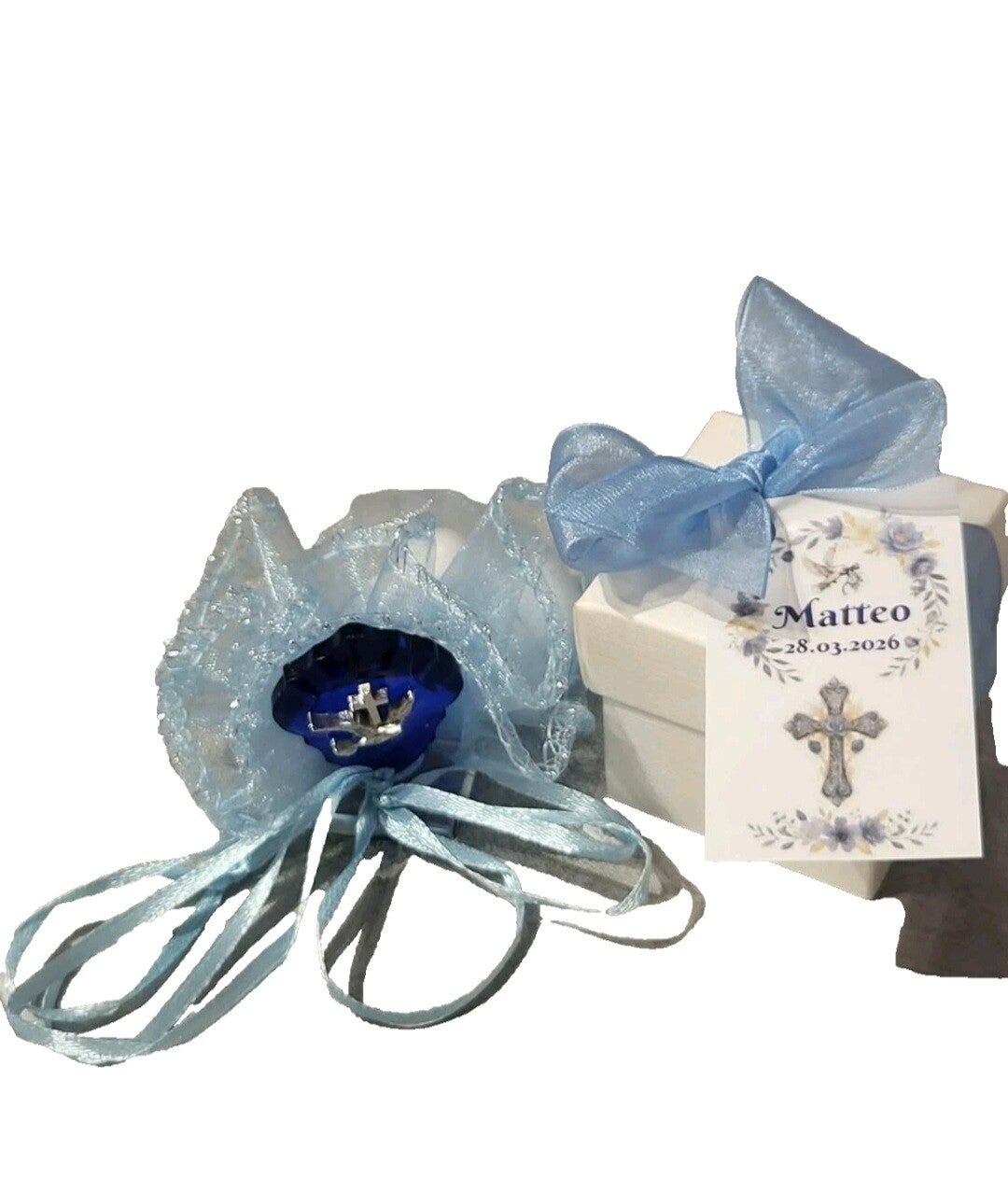 Das Gastgeschenk ist wunderschön verpackt in einer Schachtel in Farbe weiß mit Organzaband in Blau. Das Säckchen in Farbe blau aus Organza ist mit 5 weißen Taufmandeln gefüllt. Personalisiert wird das Gastgeschenk mit Namen und Taufdatum