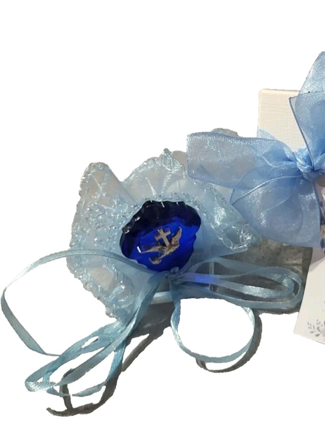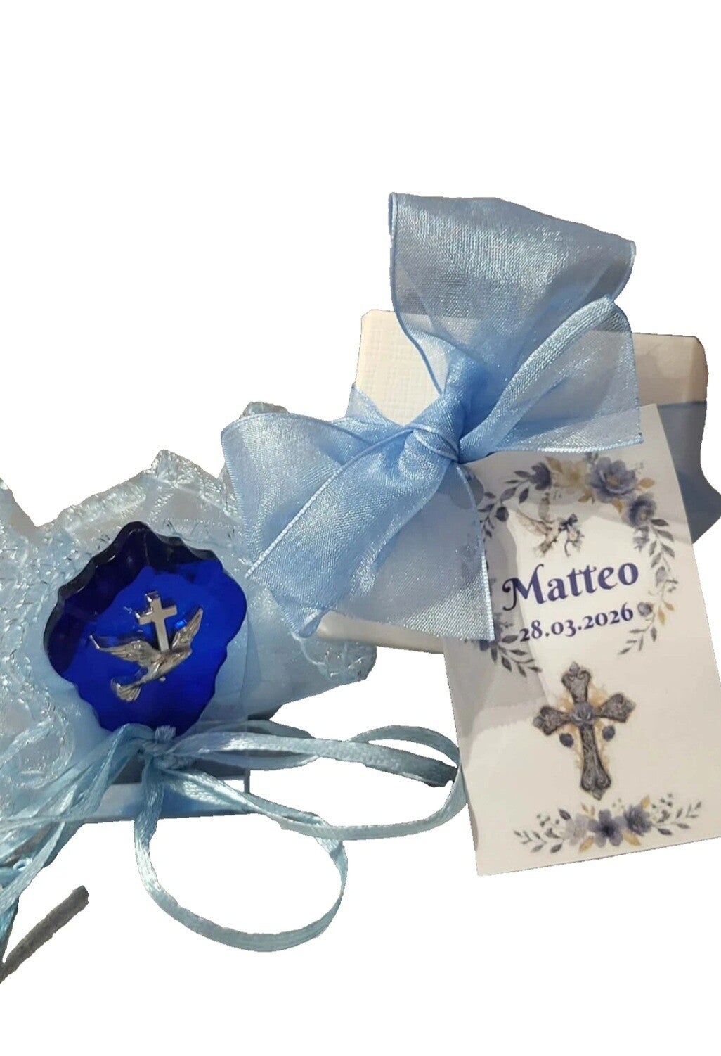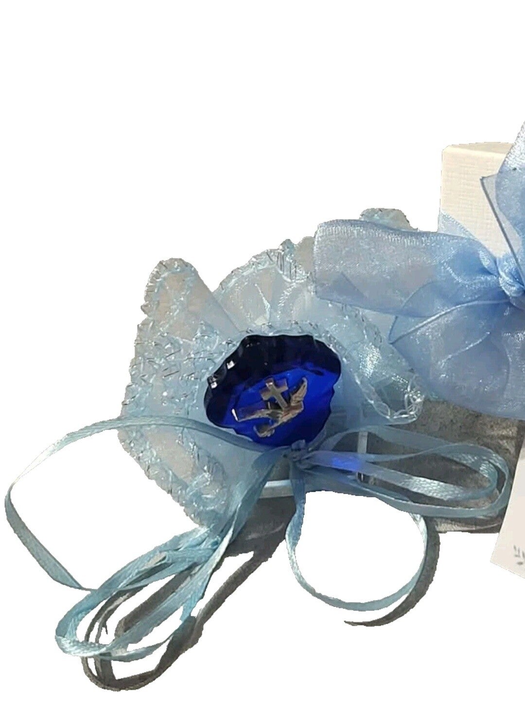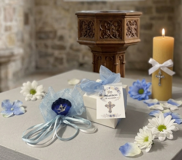 Das Gastgeschenk ist wunderschön verpackt in einer Schachtel in Farbe weiß mit Organzaband in Blau. Das Säckchen in Farbe blau aus Organza ist mit 5 weißen Taufmandeln gefüllt. Personalisiert wird das Gastgeschenk mit Namen und Taufdatum