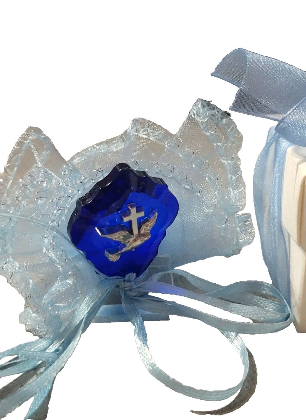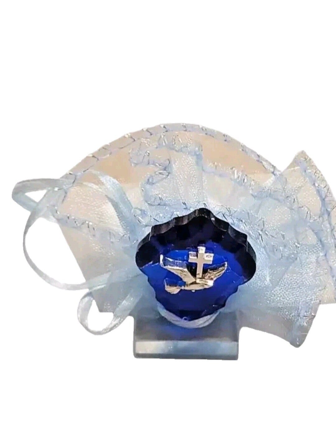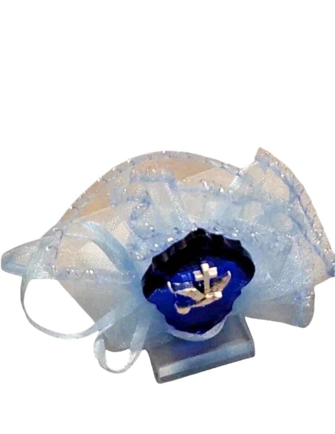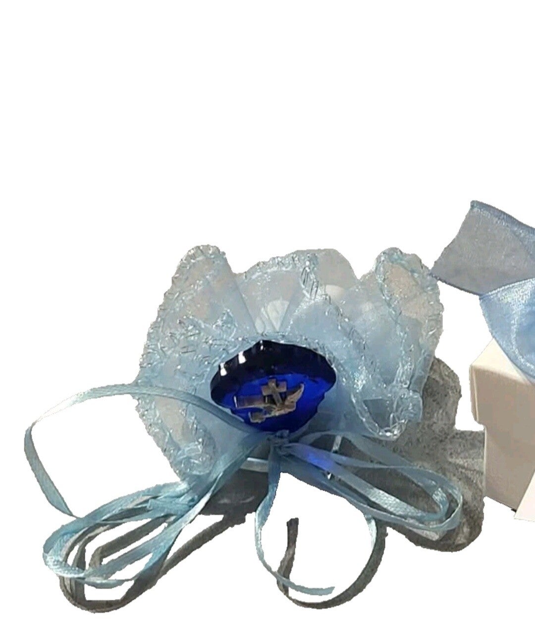 Das Gastgeschenk ist wunderschön verpackt in einer Schachtel in Farbe weiß mit Organzaband in Blau. Das Säckchen in Farbe blau aus Organza ist mit 5 weißen Taufmandeln gefüllt. Personalisiert wird das Gastgeschenk mit Namen und Taufdatum