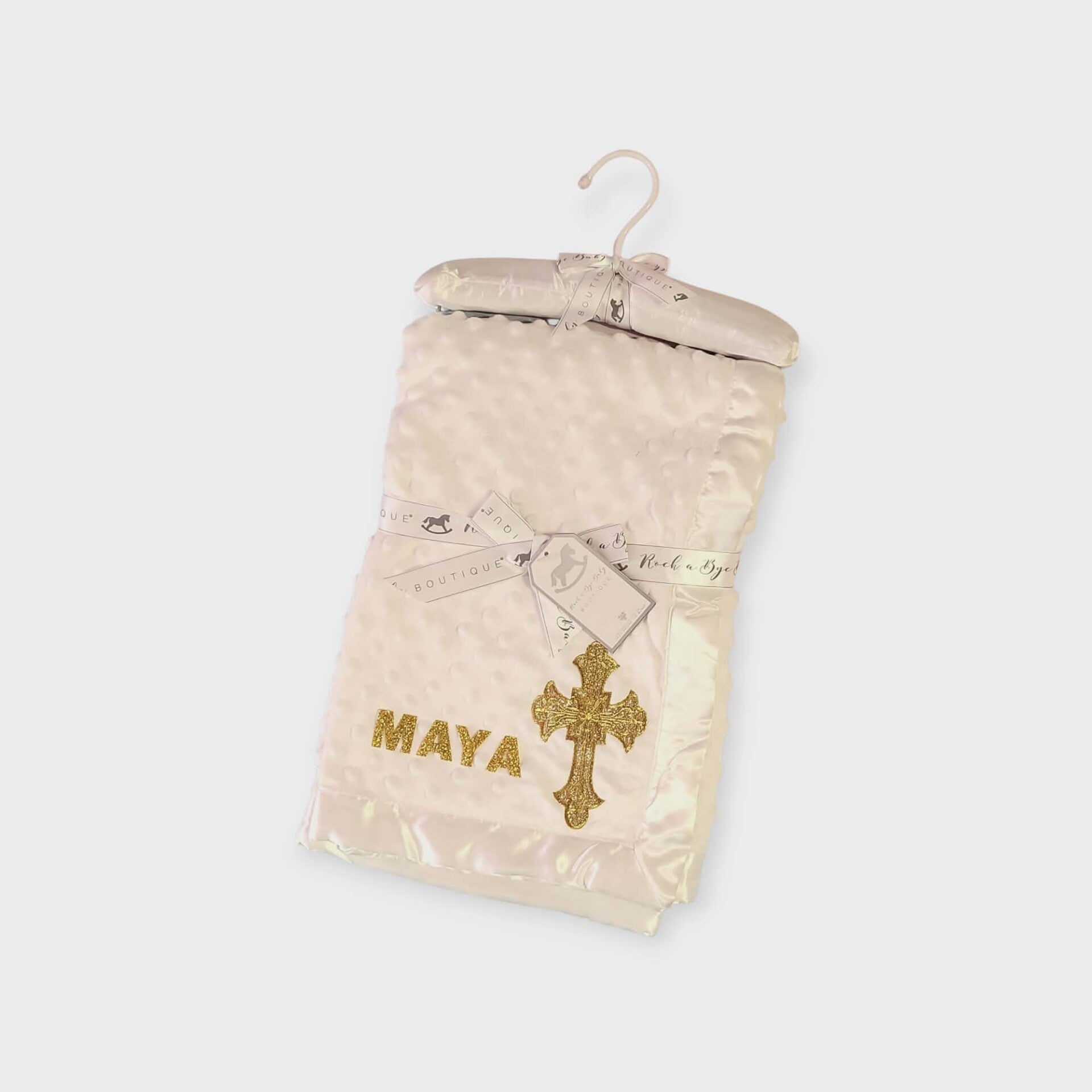 - Der Name wird mit goldenem Glitzer-Druck auf die Decke gedruckt und passt perfekt zum goldenen Kreuzmotiv (12 cm). Bitte teilen Sie uns den gewünschten Namen nach dem Kauf.