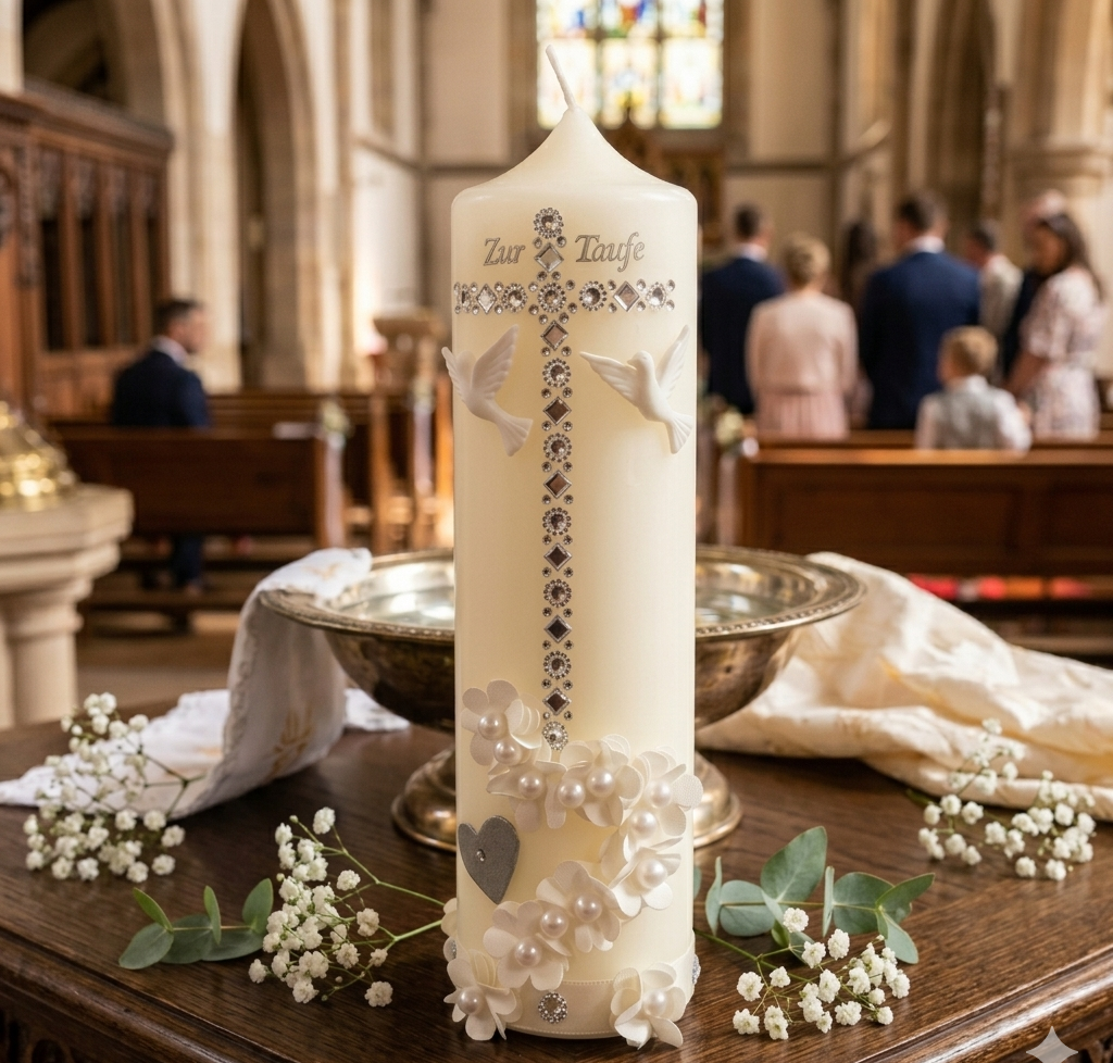Die Taufkerze ist eines der essenziellen Dinge bei diesem wichtigen, christlichen Ritus. Hier bestätigen Eltern bzw. Taufpaten den Glauben an Jesus Christus und versprechen eine christliche Erziehung ihres Mädchens oder Jungen.
